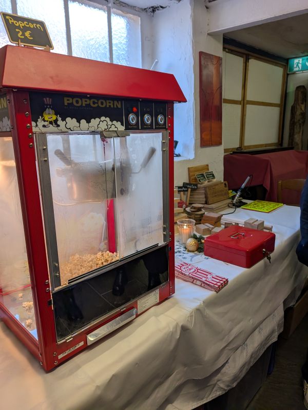 Am 21.12.2025 fand der Wiltinger Weihnachtsmarkt auf dem Dorfplatz statt. Auch unsere Schule bot wieder einen Stand an, dieses Mal in der Küferscheune. Dort erwartete die BesucherInnen eine Vielzahl verschiedener Produkte, die unsere SchülerInnen im Laufe des Schuljahres produzierten und nun zum Verkauf anboten. Der Duft von frisch gepopptem Popcorn mit unserer schuleigenen Maschine lockte Große und Kleine zu unserem Stand an. Denn neben Holzbrettchen und Weihnachtskarten boten wir in diesem Jahr auch frisches Popcorn und selbstgebrannte Mandeln an. Das war einfach nur lecker!